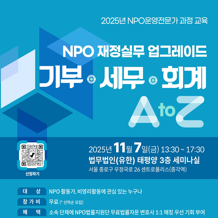 기부금품법 개정과 공익법인 관리체계 변화로 인해 모금·회계 실무 전반에 대한 이해와 전문성이 요구되고 있습니다. 재단법인 동천이 준비한 이번 교육은 NPO 실무자들이 개정 법령과 세법·회계기준을 숙지하여 공익사업을 적법하게 수행할 수 있도록 돕기 위해 마련되었습니다.